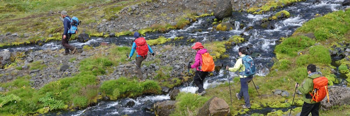 The trek starts with a trek through the Laugahraun Lava to the mountain Brennisteinsalda We will observe bubbling rivers, geothermal hot springs, beautiful lava, and colorful mountains on way as the group hike to Hrafntinnusker in 1100 meters above sea level. The view from there is fantastic if offers stunning panoramic views of the surrounding volcanic landscape and nearby glaciers.