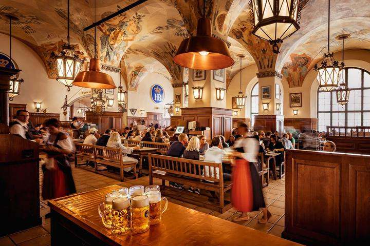 之后,我们下山乘坐公共交通返回慕尼黑市内,去希特勒当年闹事的HB啤酒馆享用一顿德国特色晚餐——烤猪肘加啤酒(欢迎晚宴)。