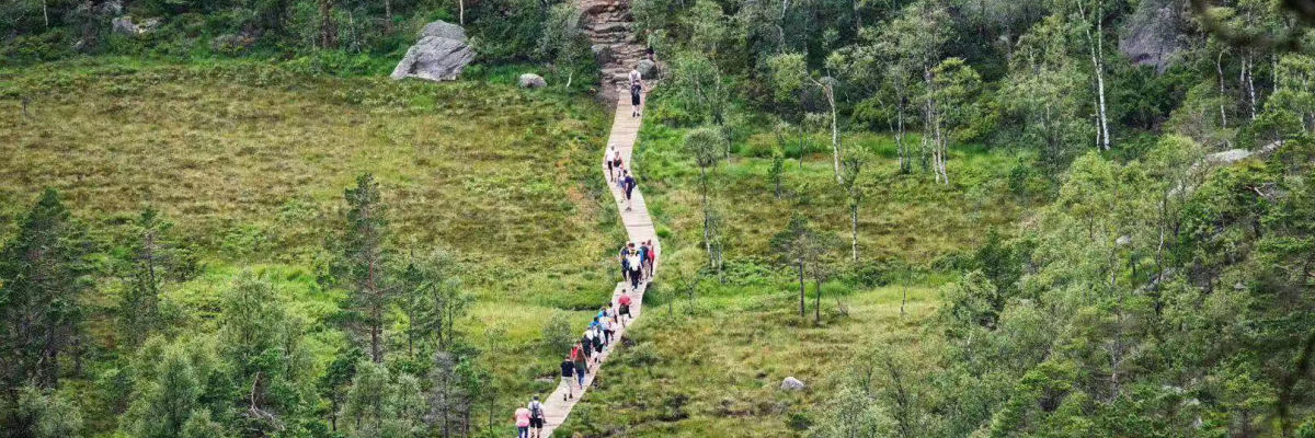 早餐后,我们将穿越峡湾前往洛夫维克(Lauvvik)。今天我们的目标是挪威最壮美的徒步道——布道石徒步(Preikestolen fjellstue),也为后续的恶魔之舌做个小热身。这个巨大的岩石平台有604米的高度,竖着插入吕瑟峡湾(Lysefjord)中。顶部的平台大约有625平方米,从远处看去,非常壮观,而走到近处,站在布道石平台上,俯瞰峡谷中的吕瑟峡湾,起伏的山峦,蜿蜒的峡湾,以及峡湾中漂浮着的游船,呈现在我们面前的就是一幅美不胜收的全景图。徒步走的道路是一条修葺过的步道,攀爬并不难,对于膝盖有伤病的朋友,建议带好登山杖与护膝。