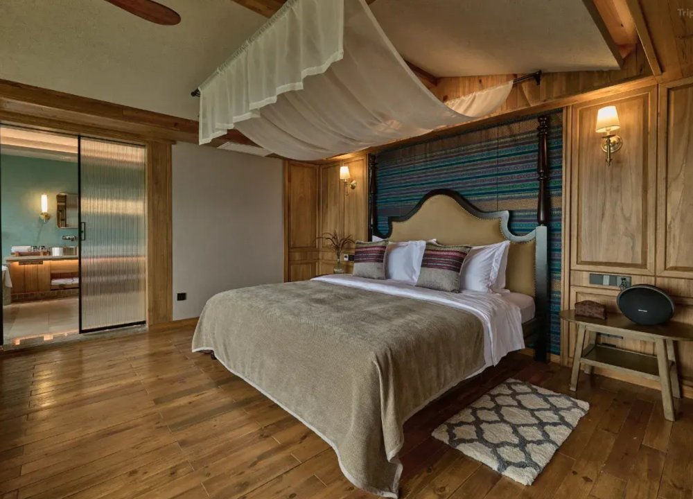 松赞丙中洛山居海拔1750米,位于云南省怒江傈僳族自治州贡山独龙族怒族自治县丙中洛镇东风村,择址于藏传佛教普化寺旁的稻田边,继续和藏族村落生息与共,延续着自己的文化脉络。 酒店窗外,田园风光如扇面般徐徐展开。梯田的尽头是绵延无尽的碧罗雪山,怒江水在雪山脚下奔涌。