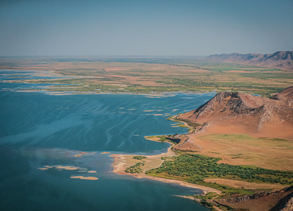 中午在城中餐厅用餐,下午驱车约 4.5 小时驶入克孜勒库姆沙漠。城市景观逐渐消失,荒原在车窗外展开。傍晚抵达位于游牧毡房营地,距离艾达尔库尔湖约 8 公里,沙质湖岸与广阔水面并存,宛如沙漠之海。