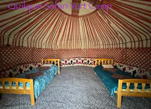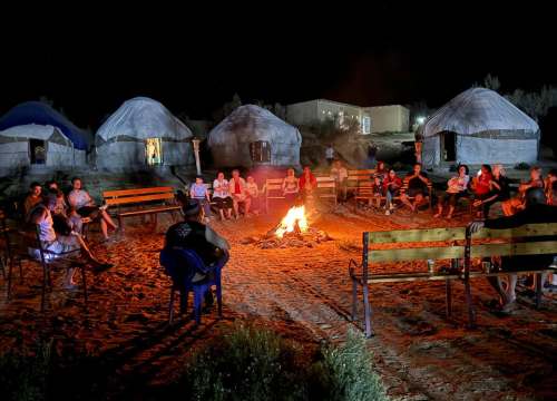 营地坐落在克孜勒库姆沙漠深处,距离艾达尔库尔湖约 8 公里。 营地2人一顶帐篷,配备整洁的公共洗手间、餐厅与基础电力,在保留原生态体验的同时,也兼顾基本舒适度。 入住传统毡房,是一次走近中亚游牧生活方式的体验。远离城市与网络,在沙漠与湖泊之间,感受时间放慢的节奏,也更容易理解丝绸之路上商队与游牧民族的日常。夜幕降临,在星空之下欣赏 Akyn 本地吟唱表演,音乐在沙漠中回荡,仿佛回到丝绸之路商队停歇的年代。