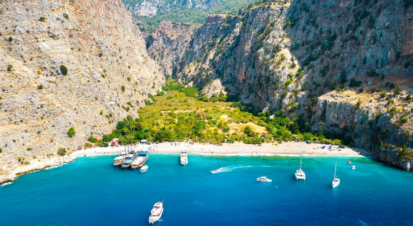 早餐后,从法拉利亚(Faralya)村附近出发,进入一段山间小径。经过一段轻微上升后,视野豁然开朗,可俯瞰蝴蝶谷(Butterfly Valley)——这是一条深入海岸线的巨大峡谷,也是利西亚海岸线上最具代表性的景观之一。