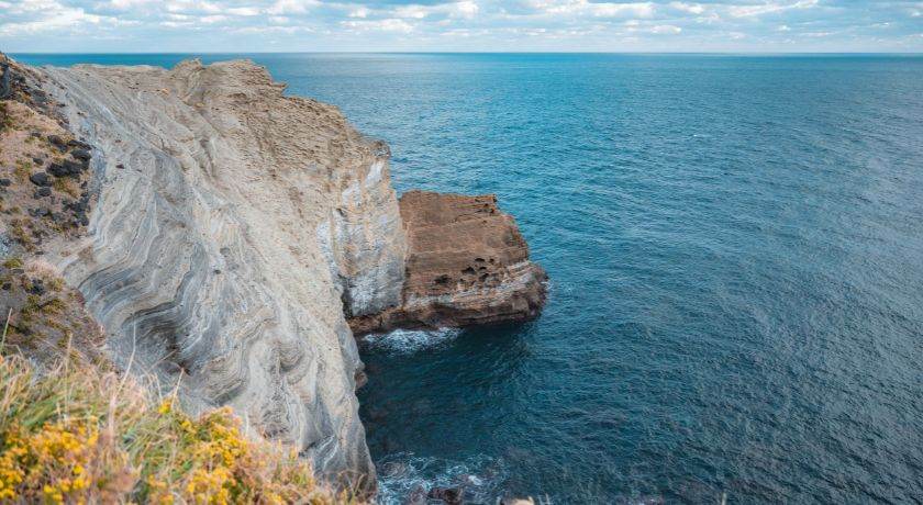【傍晚】:打卡最美咖啡馆和圣地亚哥友谊之路的标志石碑,眺望城山日出峰。平坦的草地延伸到海边,火山岩石形成的悬崖使得海岸线显得格外雄伟。大海、悬崖、草原和远处的山脉共同构成了美丽的画卷,尤其是晴天时,蓝天与大海交相辉映,景色迷人。